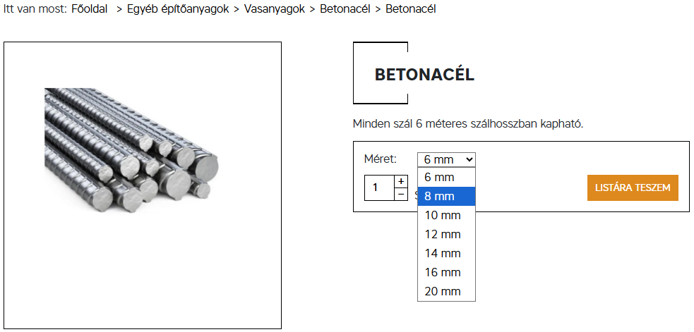 Például, ha egy építkezés során többféle méretben van szüksége betonacélra, mindegyiket hozzá tudja adni a  listához. Ez a funkció biztosítja, hogy a teljes projektjére vonatkozó anyaglista egyetlen, átlátható ajánlatkérésben szerepeljen, elkerülve a felesleges ismétléseket és a bonyolult listákat.
